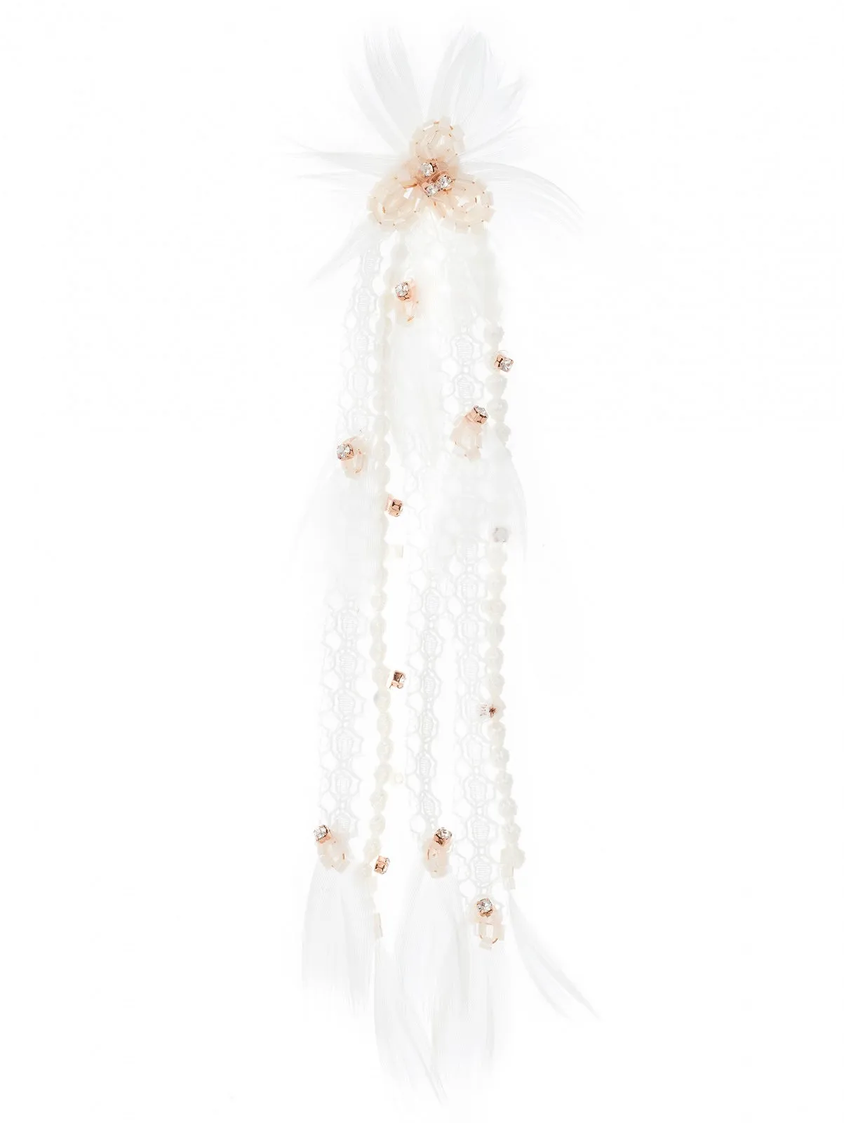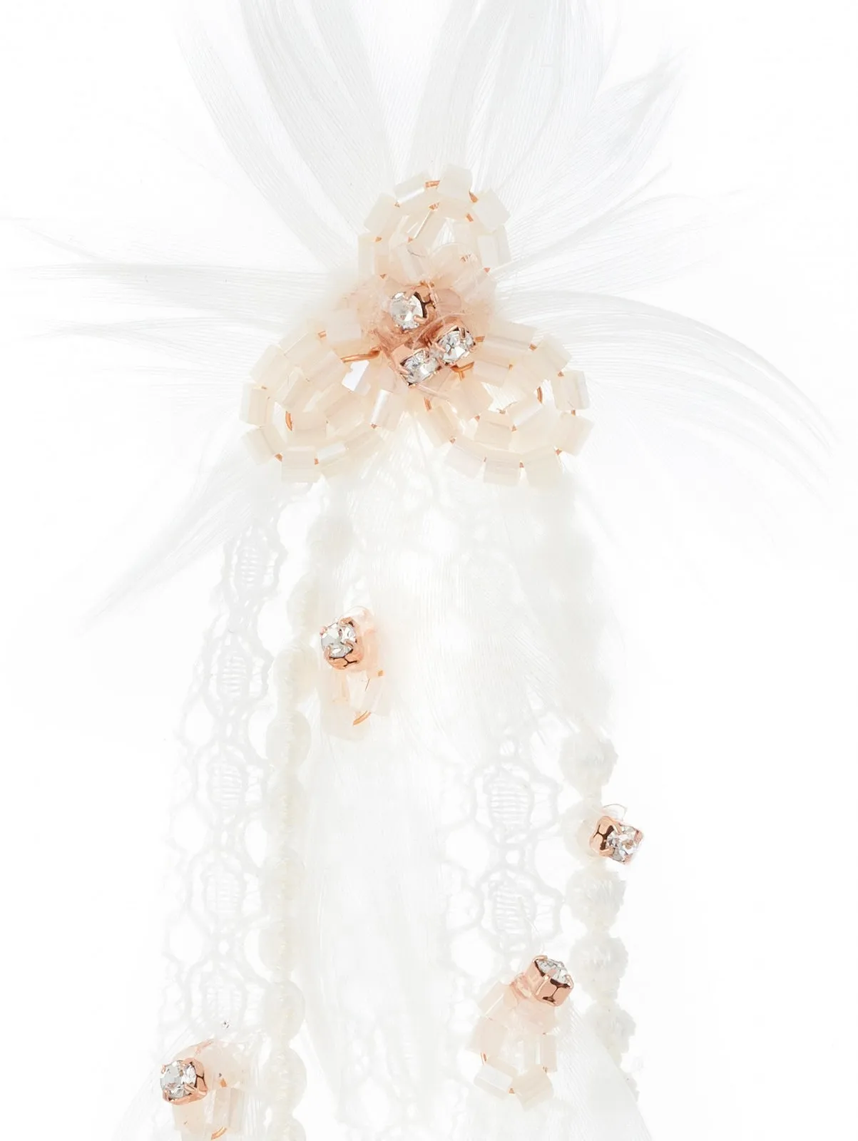 - Materialien: Elfenbeinfarbene Federn, blushfarbene Perlen, naturfarbene Strasssteinchen, elfenbeinfarbene Spitzenbänder