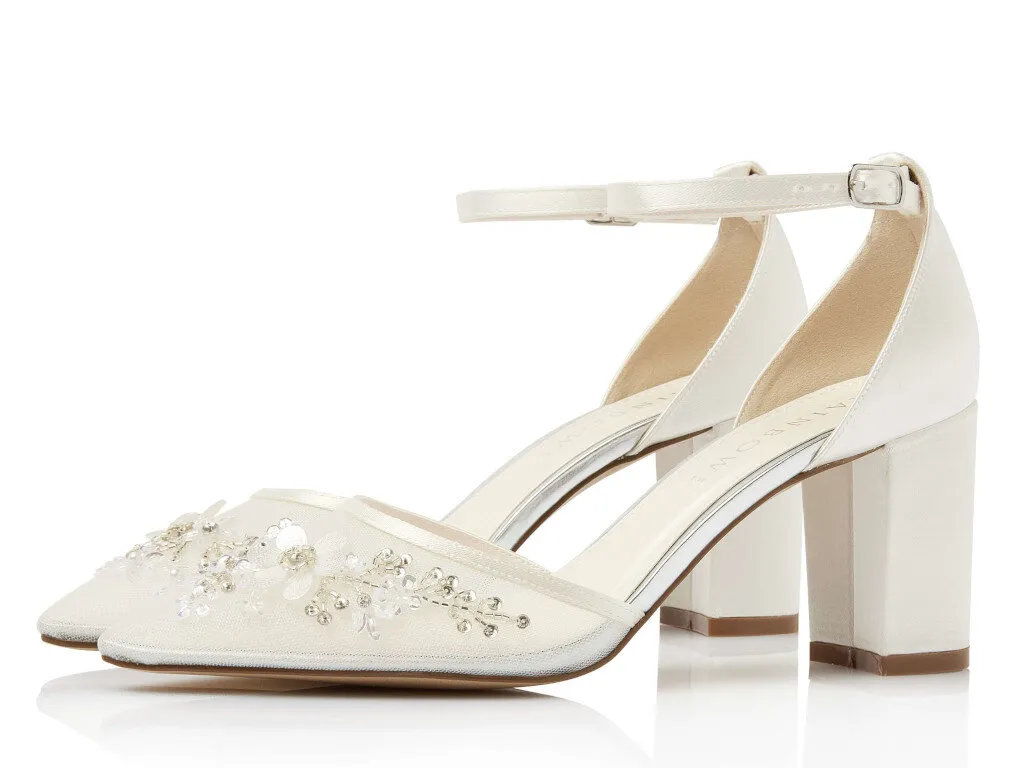 Die Azzura Brautschuhe bestehen aus feinem Ivory Satin und sind mit leicht transparentem Mesh kombiniert, das dem Schuh eine moderne und zugleich romantische Note verleiht. Die funkelnden Schmuckstein-Verzierungen an den Seiten sorgen für einen Hauch von Luxus.