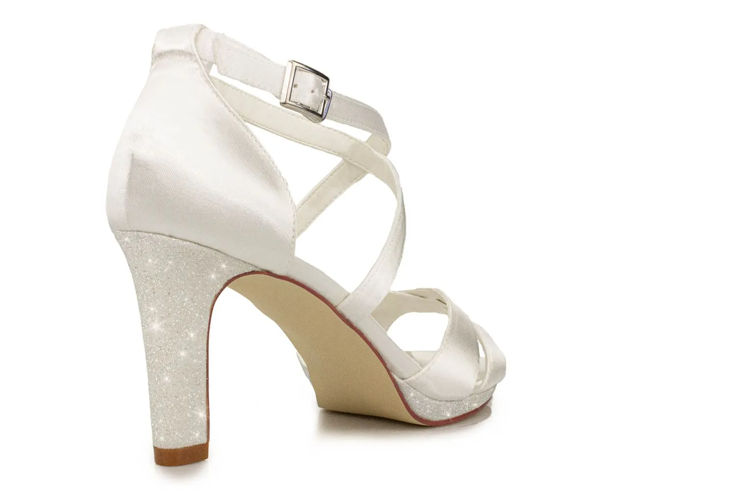 Der Cassandra Brautschuh wird aus einer Kombination von hochwertigem Satin und funkelndem Glitter gefertigt. Die elegante Farbe Ivory (ein sanfter Creme-Ton) passt perfekt zu den meisten Hochzeitskleidern und lässt sich wunderbar mit verschiedenen Accessoires kombinieren. Das offene Sandaletten-Design sorgt zudem für einen luftigen Tragekomfort, der sich besonders bei Sommerhochzeiten bewährt.