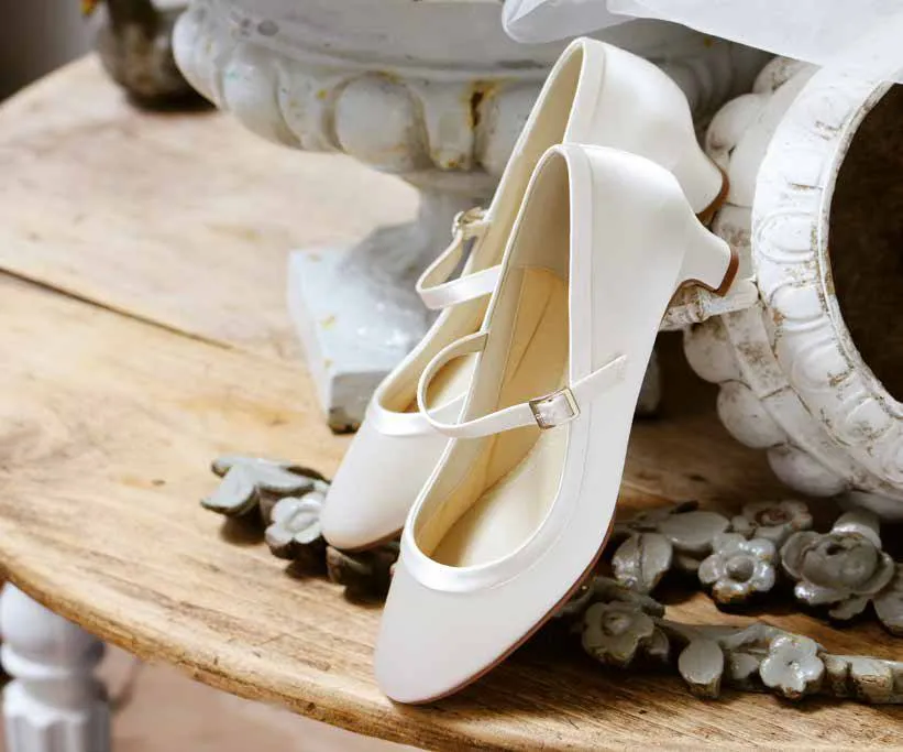 - Design: Eleganter Brautschuh mit Riemchen und runder Kappe